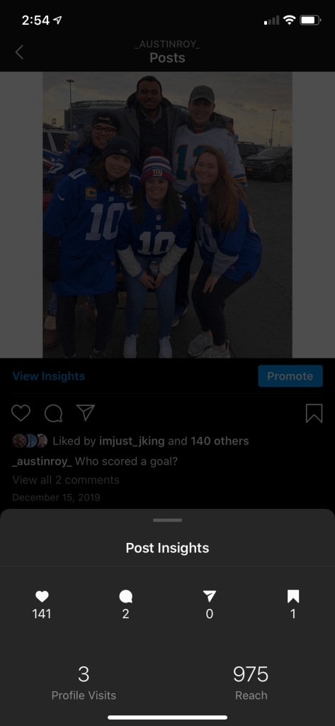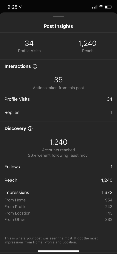 Now these are usually the first few things one may notice. Depending on the social network one is using, the platform may offer a more in-depth view of metrics to be analyzed by the creator of the post. I will be analyzing a personal post made on Instagram. While I am on other social media platforms, I enjoy Instagram because my page is set up as a business account which allows me to gain further insight in understanding how my followers interact with my posts. For more information on understanding the difference between a personal instagram and business Instagram account, click here.