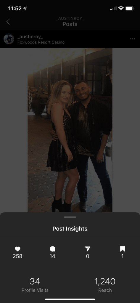 Now let’s compare the two and make a basic conclusion. Both of these images were posted on a Sunday. They each have a photo and a few words in the caption section. The only difference here is that this image does not have a location set. If we wanted to make a quick conclusion at analyzing this basic data, we could say that this image could have done better if there was a location tagged along with it. This could be a general conclusion for anyone who is not the creator of this post. Thankfully, Instagram offers their Insights tool to those who have a business account. Let’s go a step further and continue analyzing the Image from Foxwoods Resort Casino.