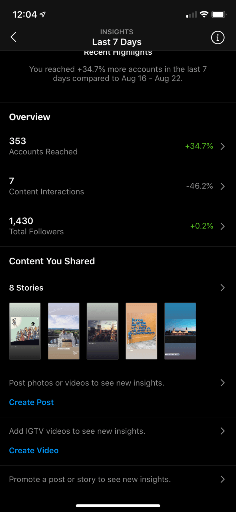 Remember, this option is only seen and can be accessed by you as long as your profile is set up as a business account. Once clicking on this option you’ll be met with a screen that shows you a quick snap shot of your most recent activity as seen below: