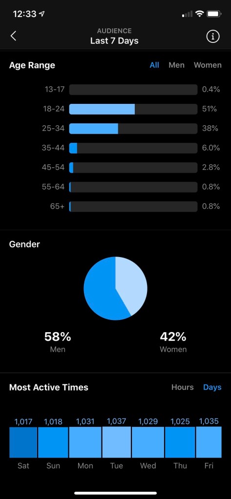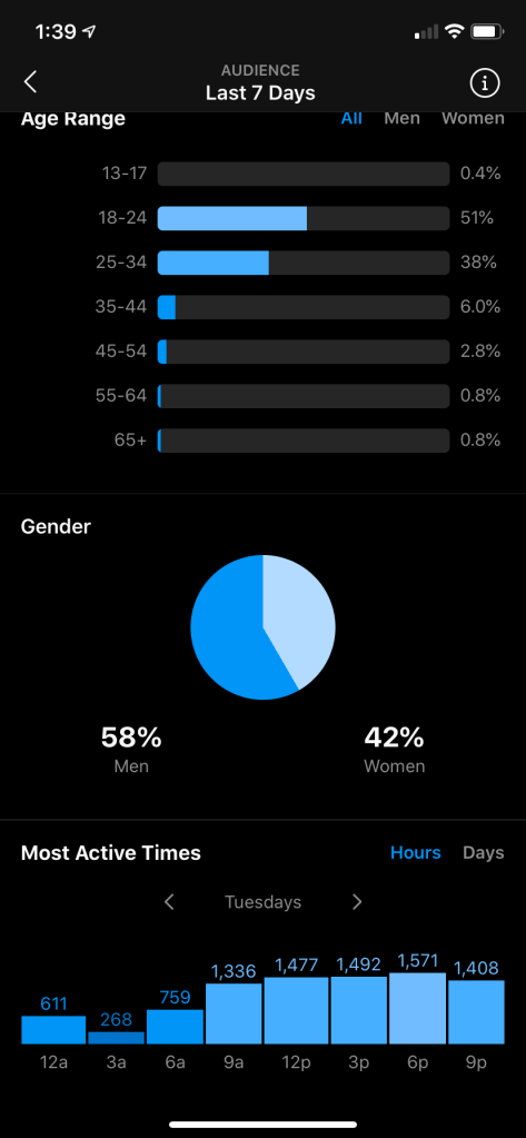 You can see above that there is an option to change the day displayed to help see what hours are the busiest for followers. I switched the day to Sunday as January 5th, 2020 fell on a Sunday. If I wanted to increase my presence on Instagram, at first glance- it might have been wise to have posted this photo between 6pm-9pm as that is when most of my followers seem to be active on Sundays. Now to further the point, if I was a brand and I wanted to maximize my full potential of increasing brand awareness or engagement, I may have wanted to pay closer attention to what day’s are the busiest for my followers. If we reference the image above that displays Most Active Days, we can see that my followers are most active on Tuesdays.