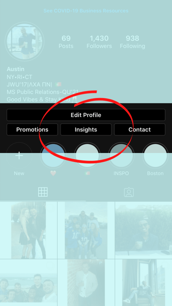 I stated above that I wanted my impressions to increase, primarily from my locations. We determined that I could increase my impressions from location by doing more research on what tagged locations have more click traffic. Keep in mind, this was a conclusion made at a first glance of the impressions listed above. We will still be analyzing the same post but this time we will be looking from a different angle. Let’s say I still care about brand awareness but now I want to optimize my exposure efforts. The Instagram Insight Tool breaks down a number of different data sets that could help anyone depending on what it is they are looking for. You can access the Insight option through your profile: