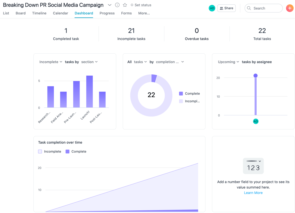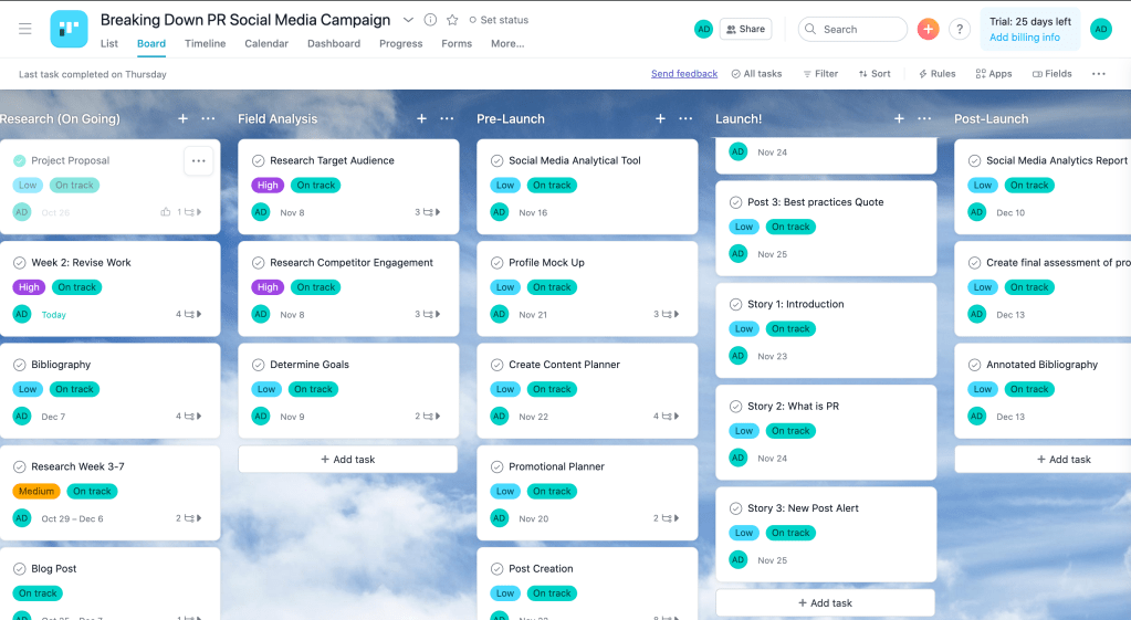 What I enjoy about Asana is the many features it offers. Asana allows me to break down each phase of the project into carefully detailed stages accompanied with tasks, and subtasks as well. I am also able to mark the importance of the task at hand, along with what stage I am at. This will be a tremendous help in staying on track with every aspect of this project. I’m also able to view each subject in list, board, timeline and calendar form. For the social media campaign, I created five phases: Research, Final Analysis, Pre-Launch, Launch, and Post-Launch. Each phase is broken up into smaller categories. These categories will include detailed subtasks and timeframes for each subtask to be completed. Each task is broken down to an actionable detail that benefits the overall achievement of the category itself. By structuring it this way, it will help me be able to move onto the next phase of the project.